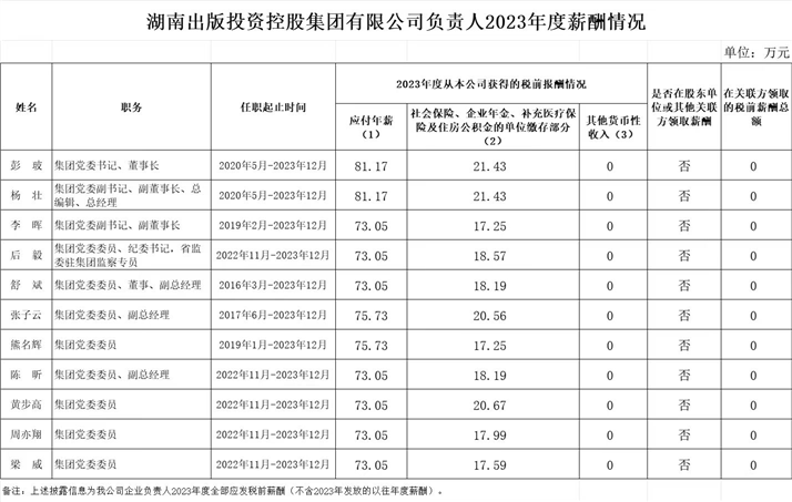 湖南出版投資控股集團(tuán)有限公司負(fù)責(zé)人2023年度薪酬公示
