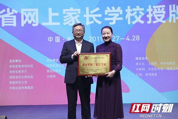 湖南省婦聯(lián)主席、黨委書記姜欣(右)向湖南教育出版社家校共育網(wǎng)授牌,成立“湖南省網(wǎng)上家長學(xué)校”。